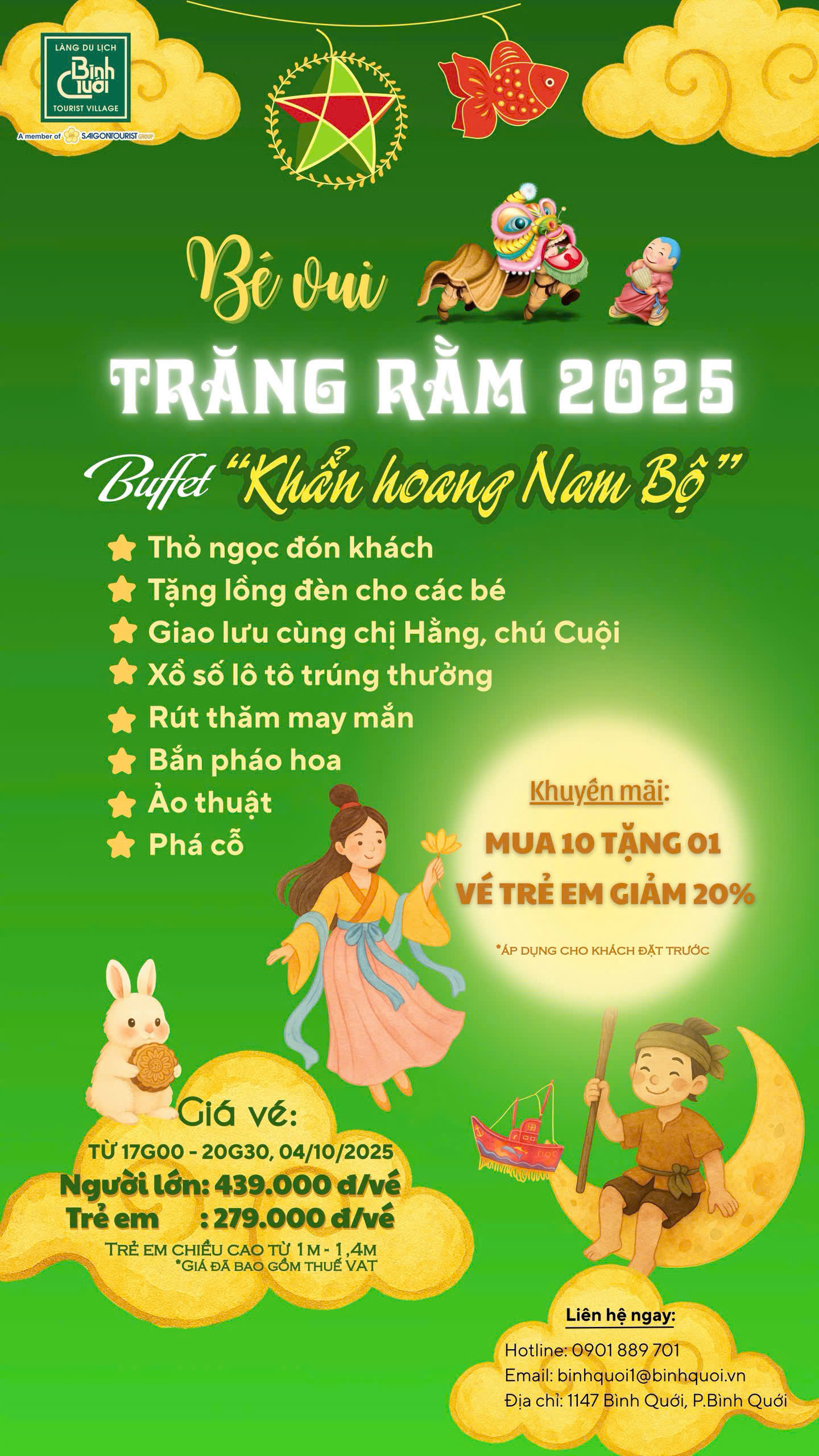 Đêm hội Trăng rằm sẽ là điểm đến để gia đình thưởng thức các món ăn đặc sản quê nhà. Tại Bình Quới 1 – nơi hành trình cảm xúc bắt đầu, nơi tiếng cười trẻ thơ kết nối và lan tỏa yêu thương.